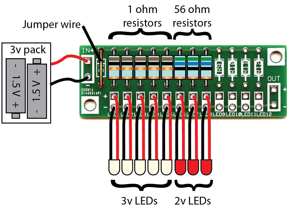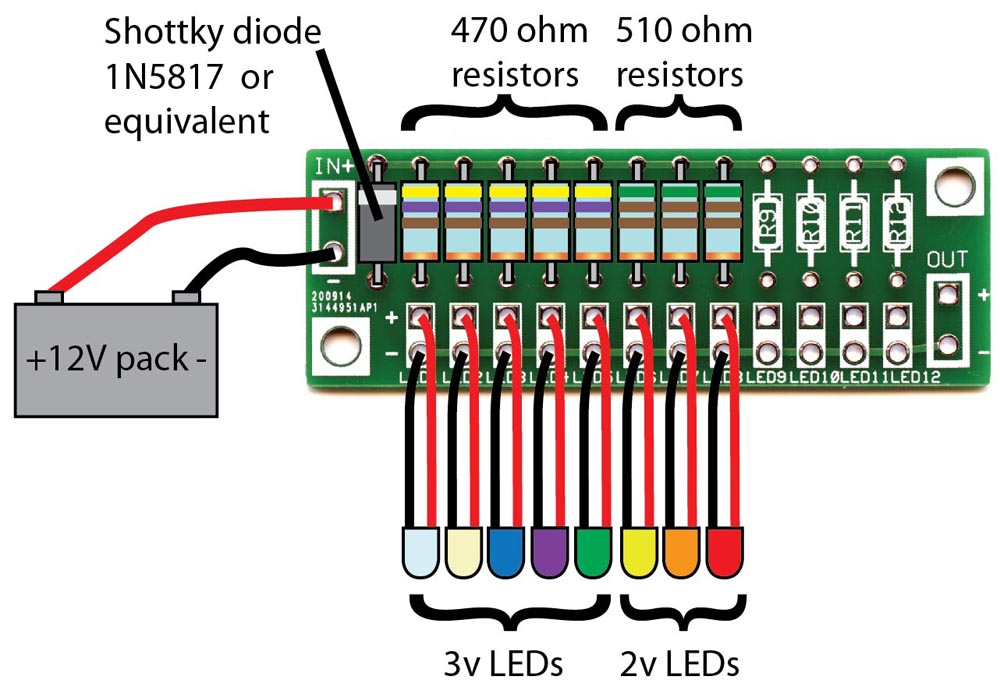 hooked up backwards. It is very important to note that LEDs and the Shottky diode are polarity sensitive, so you must make sure you install them correctly. |